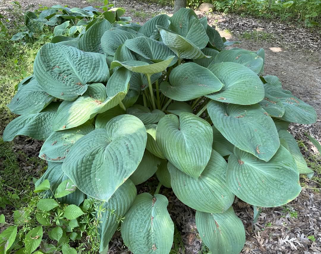 This giant plant forms a massive mound of large blue/green, heart shaped leaves. Blue green leaves are slightly corrugated with bluest in early spring.